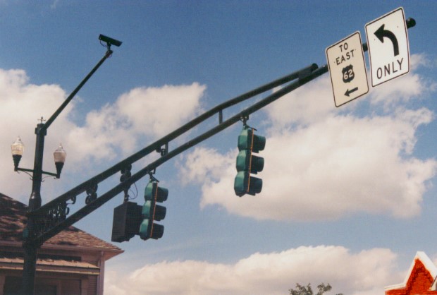 Too much green here (not counting the green lights). Green light supports, green street signs, green lense covers and backing to the traffic lights. The curly cues in the traffic light support are likely to be a streetscape recomended addition for style points. US 62 @ Oh 317.