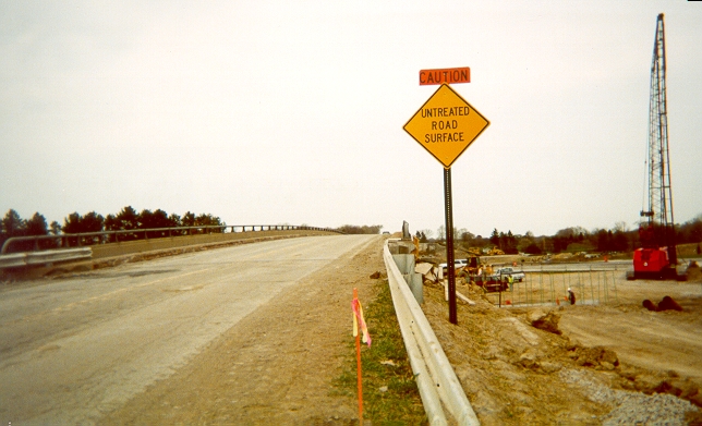 Northbound, at the I-90 bridge. A sign like this also existed southbound from Ohio 84 but it was removed about 45 minutes before I started taking pictures. Note the beginning of the foundation for the east side of the widened bridge (the existing supports were incorporated into the new bridge) (4/17/03):