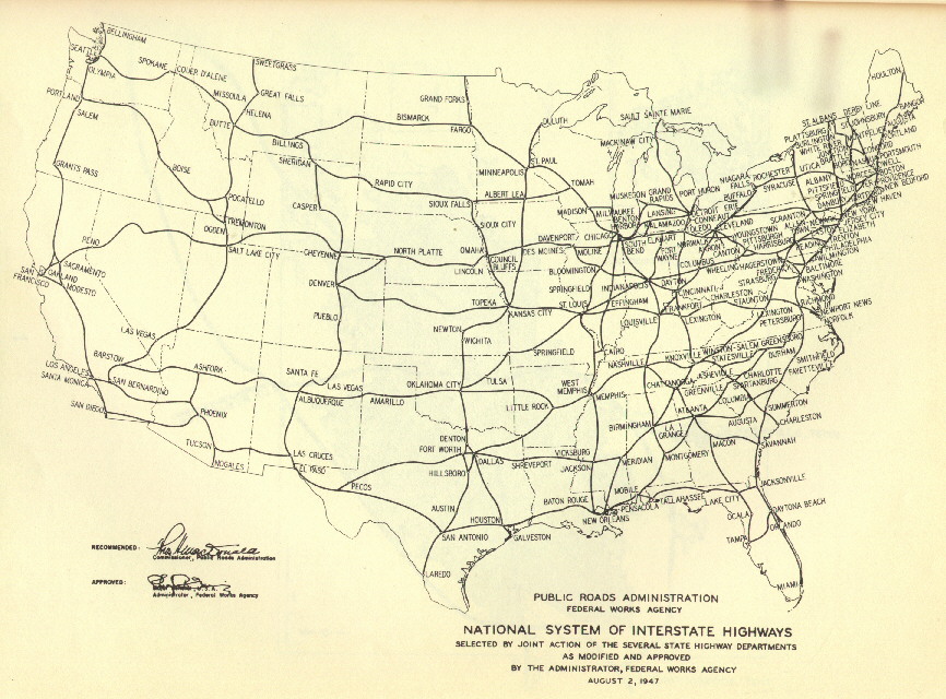 The source for this page is Interregional highways. Message from the President of the United States, transmitting a report of the National interregional highway committee, outlining and recommending a national system of interregional highways by the National Interregional Highway Committee, US GPO 1944, Library of Congress call number TE23 .A5 1944 (more info)